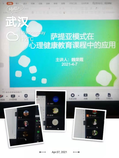 4月7日晚,心理教研室专兼职教师借助腾讯会议举行了《萨提亚在老员工心理健康教育课程中的运用》主题分享交流会。武汉公司心理咨询中心魏荣霞副教授应邀分享了该校心理健康课程的建设经验,着重展示了运用萨提亚技术,从传统的讲授式教学向体验式教学转变的课程设计思路。