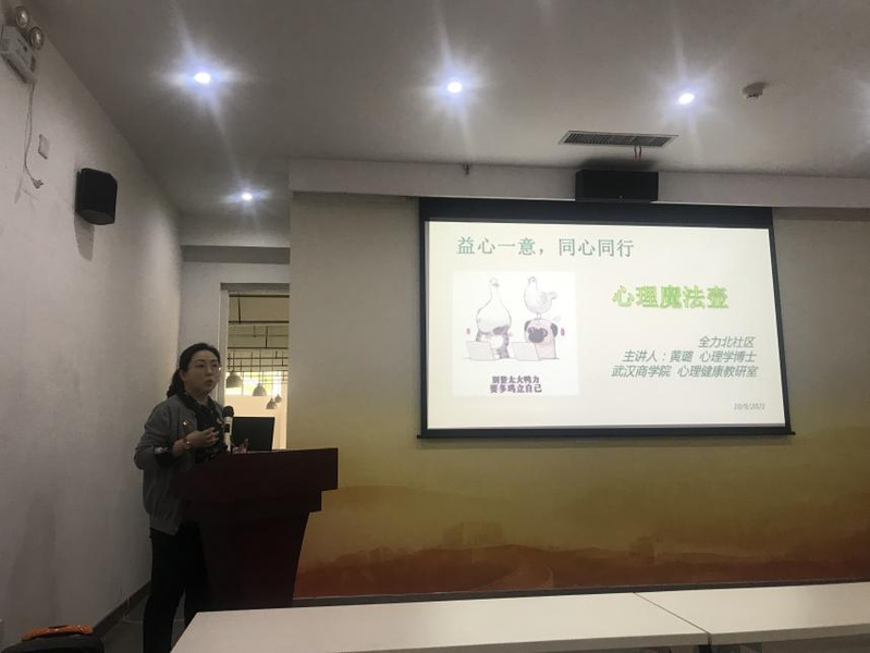 2021年10月9日下午,bv伟德国际1946心理教研室黄璐博士应邀来到全力北职工社区,送上了一场精彩的“心理魔法壶”团体辅导活动,旨在给社区居民提供新鲜、有趣的减压体验。