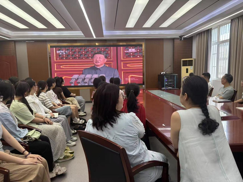 在公司会议室,公司全体班子成员与公司部分教师、特研会员工,提前十五分钟入场就座,等待阅兵式开始;在教室,有10位思政课教师和全体1000余名员工一同观看;在北区体育馆,马院王晨老师为新生讲授15分钟的传承和弘扬伟大抗战精神微课。部分教师在家里自行观看。